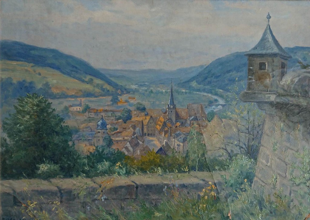 Öl/Lwd/Faserplatte, Ansicht d. Festung Rosenberg m. Staffagefig. an derMauer u. Ausblick über d. sommerl. Landschaft. 38 × 53 cm, Auktionshaus Wendl