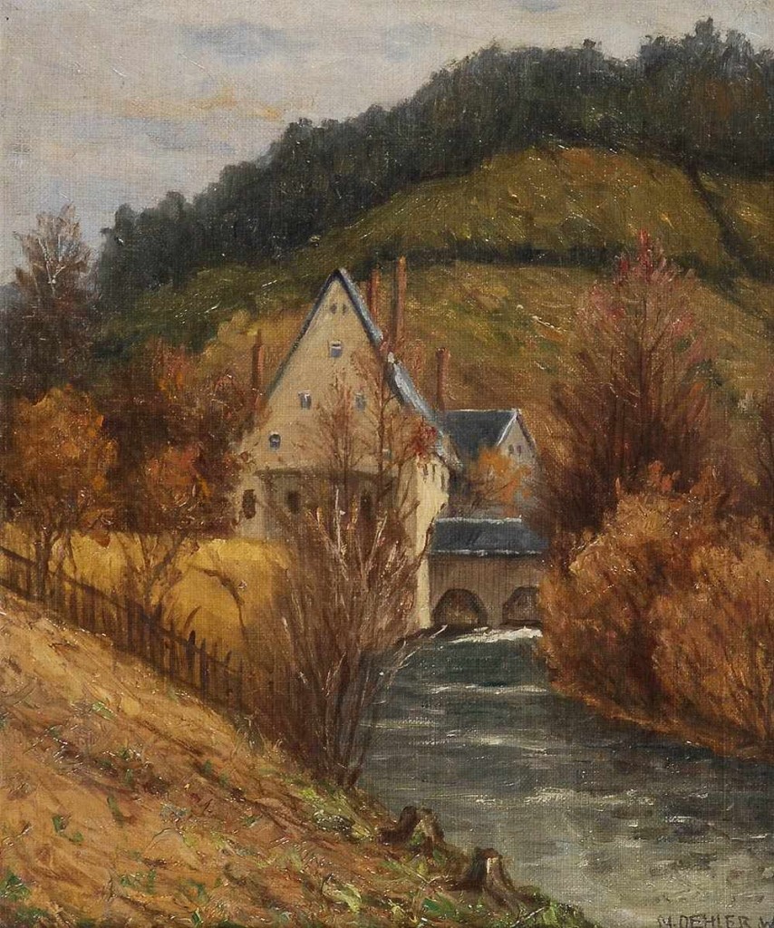 Öl/Leinwand/Karton, rechts unten signiert mit Zusatz Weimar und undeutlichem Datum, verso bezeichnet/datiert: 1912. Stimmungsvolles Licht über der Flussbiegung mit herbstlichen Uferbäumen und -sträuchern sowie Blick zu den Häusern in der Ferne. Etwas retuschiert, einige Altersspuren. 28 x 37 cm, Goldstuckrahmen 41 x 49 cm Auktionshaus Wendl Rudolstadt